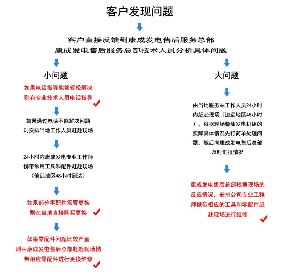 2、故障維修在收到用戶維修通知時,該通知應(yīng)是傳真函件。售后服務(wù)部將在2小時內(nèi)派出工程技術(shù)人員,24小時內(nèi)抵達(dá)所要維修設(shè)備的地點(diǎn)(邊遠(yuǎn)地區(qū)48小時應(yīng)到達(dá))。售后服務(wù)部將建立用戶的技術(shù)檔案,定期或不定期地咨詢、了解用戶設(shè)備的使用狀況,以便使您的柴油發(fā)電機(jī)組處在良好的備用狀態(tài)。每年定期或不定期的拜訪使用康成柴油發(fā)電機(jī)組的用戶,記錄用戶對我們售后服務(wù)部的意見以及良好的建議。